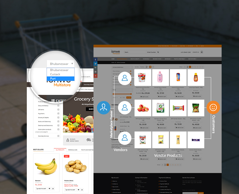 We also offer a multi-vendor marketplace for grocery eCommerce stores, who wish to transform their small business into the leading online marketplace and earn commission from multiple sellers. It is a comprehensive B2B and B2C platform with feature-rich marketplace functionalities to reach out far and wider customer base while offering one stop solution to multiple sellers.